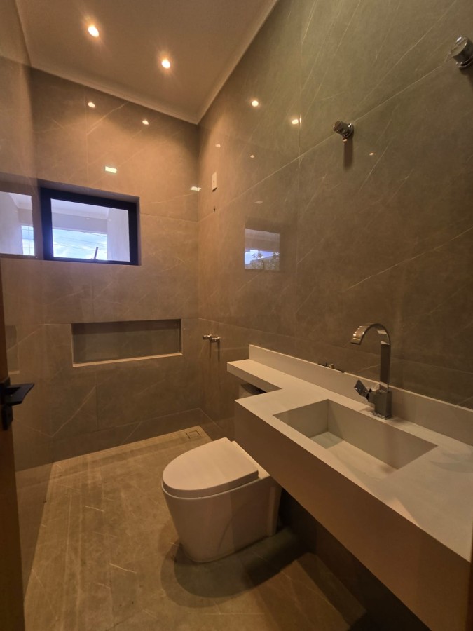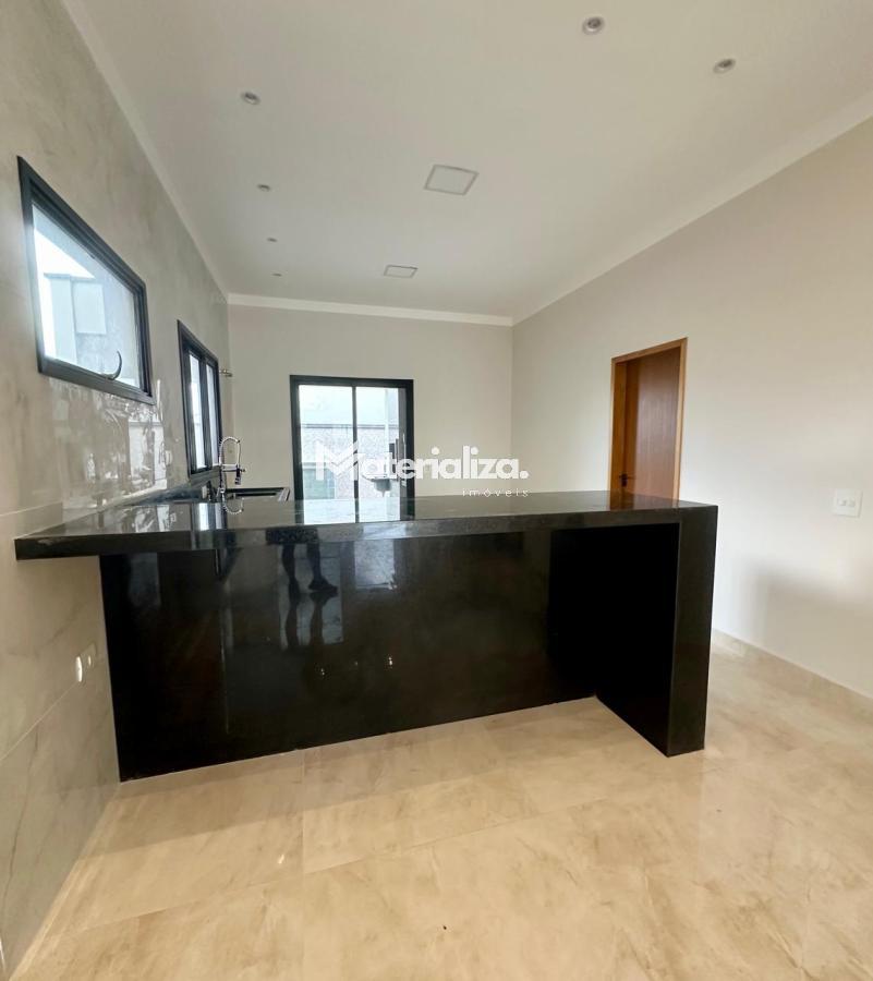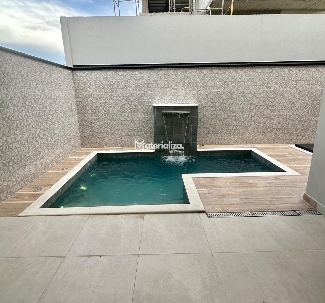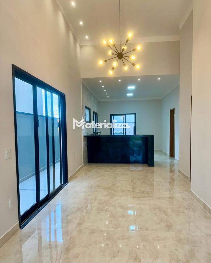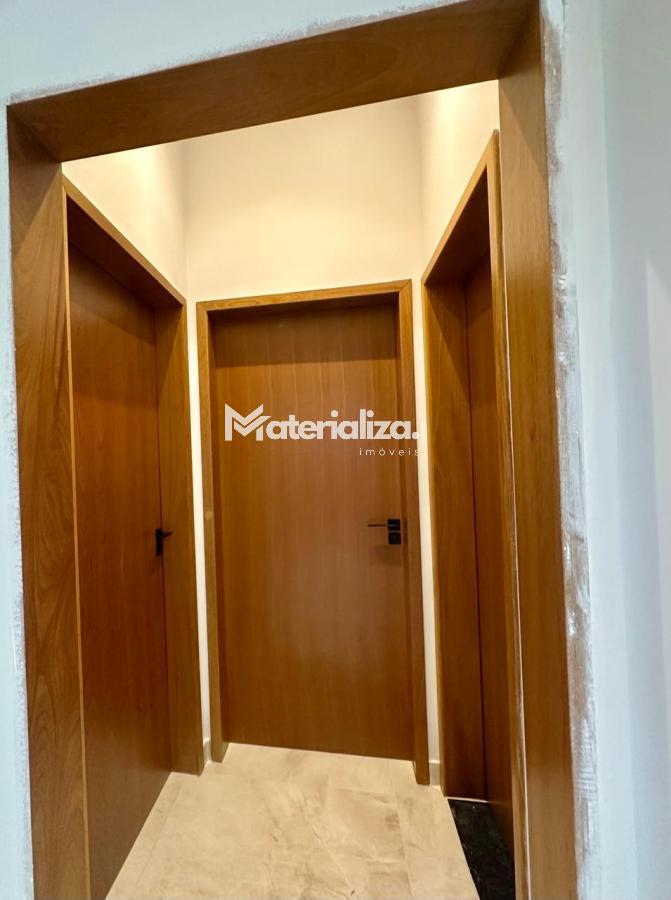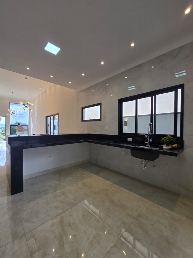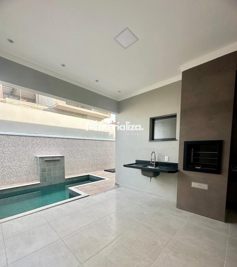 Bancada, pia e lavatórios em granito, conta com um projeto iluminotecnico super moderno, piscina em concreto armado com cascata e led, painel em alumínio ripado na parede da garagem como consta no projeto, na cor amadeirado acompanhando o modelo e cor da porta de entrada. Sendo três dormitórios, um deles é uma suíte com closet, banheiro social, sala de estar, sala de jantar, cozinha, área gourmet com churrasqueira integrada próximo a piscina, banheiro externo, lavanderia, ducha, garagem coberta para dois automóveis. Esquadrias pretas linha premium. Condomínio conta com uma atrativa área de laser, piscina, academia, campo de futebol e salão de festas.