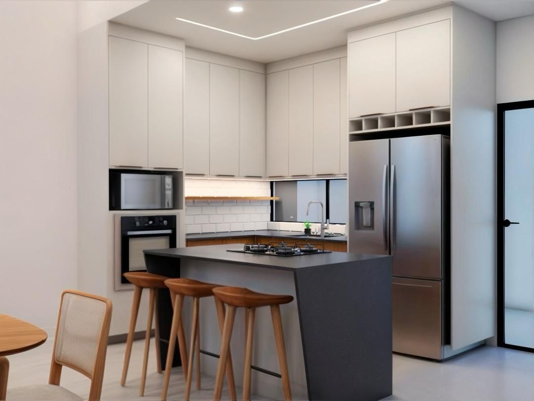 Cozinha planejada com cooktop na ilha, calha úmida na bancada e torneira gourmet